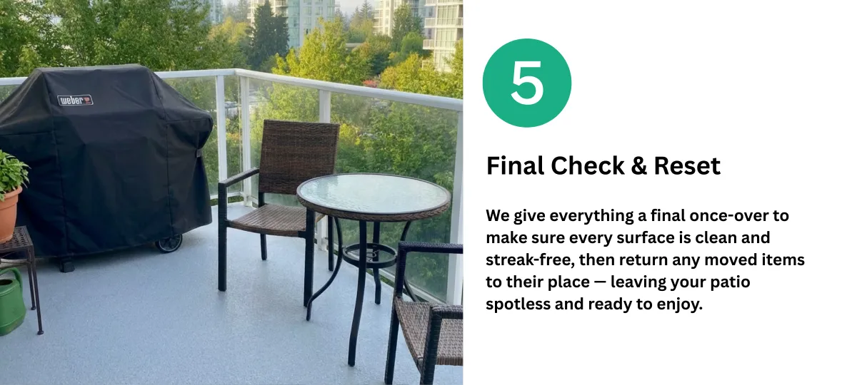 Every job is wrapped up with a final pass — resetting furniture, and checking details so nothing’s missed and your patio finally looks clean.