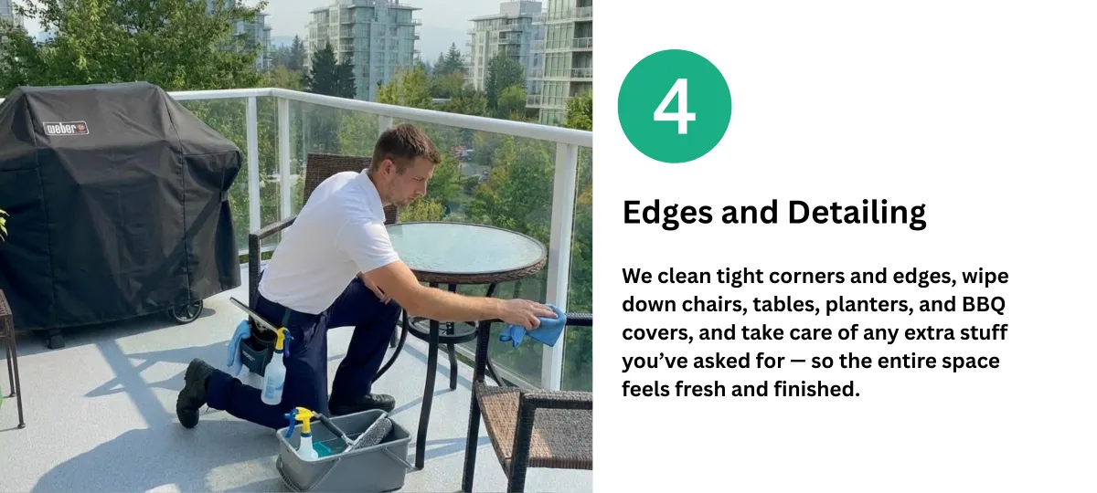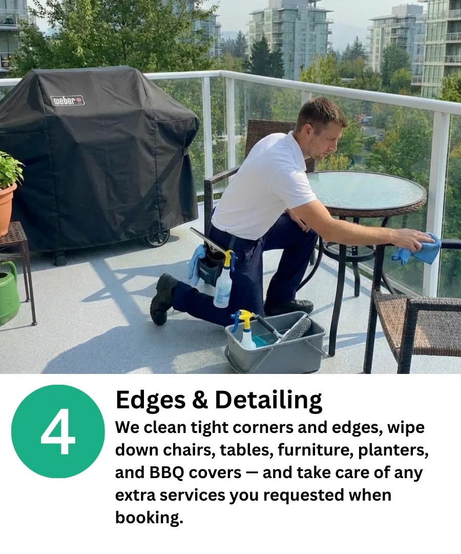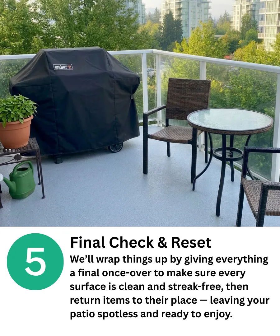 We move the furniture, plants, mats, and BBQs, clean under and around everything, and put it all back exactly how we found it.